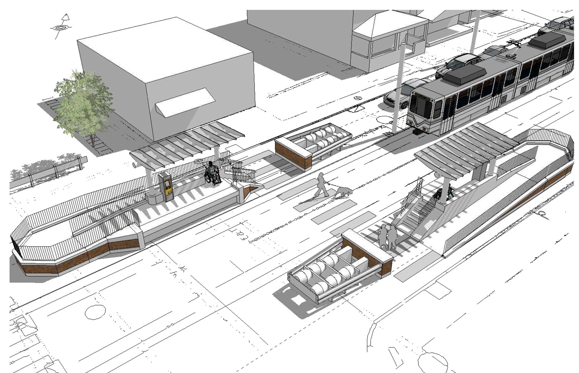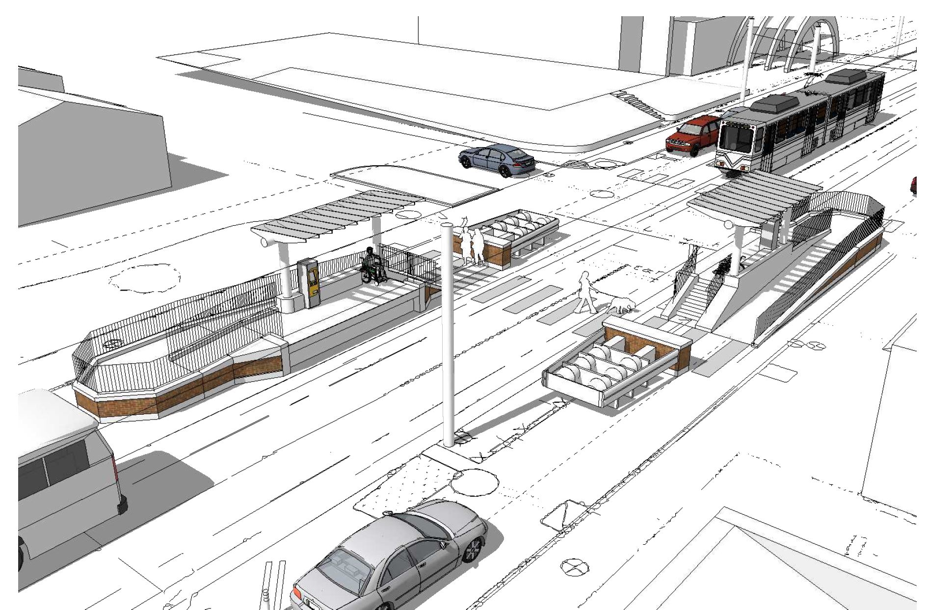 Station design concepts have been developed for public outreach and feedback. The concepts follow state and local design standards and codes covering pedestrian safety, traffic patterns, impacts to existing parking, bus boarding during disruptions in light rail service, and patron comfort.