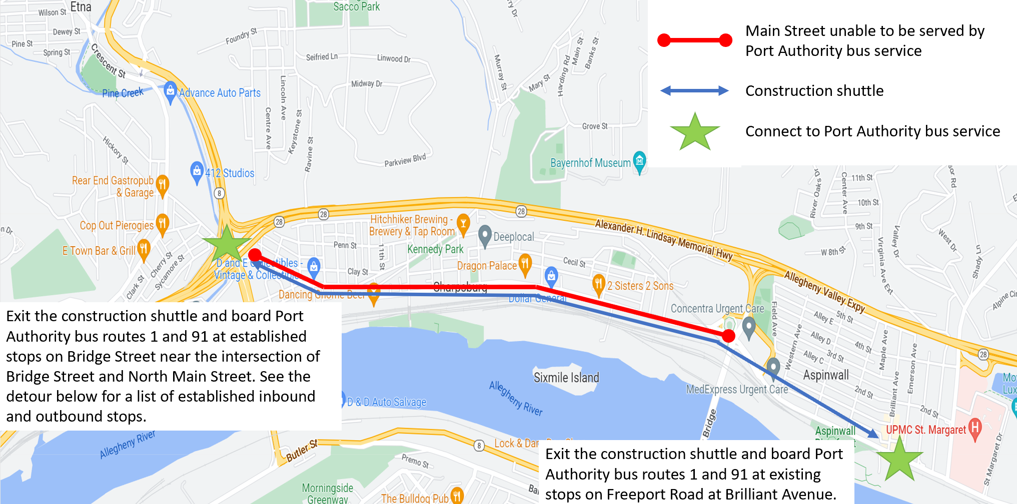 A free PennDOT construction shuttle will serve stops along Main Street between the 62nd Street Bridge (North Main Street at Bridge Street), and Brilliant Avenue at Loop Street in Aspinwall.