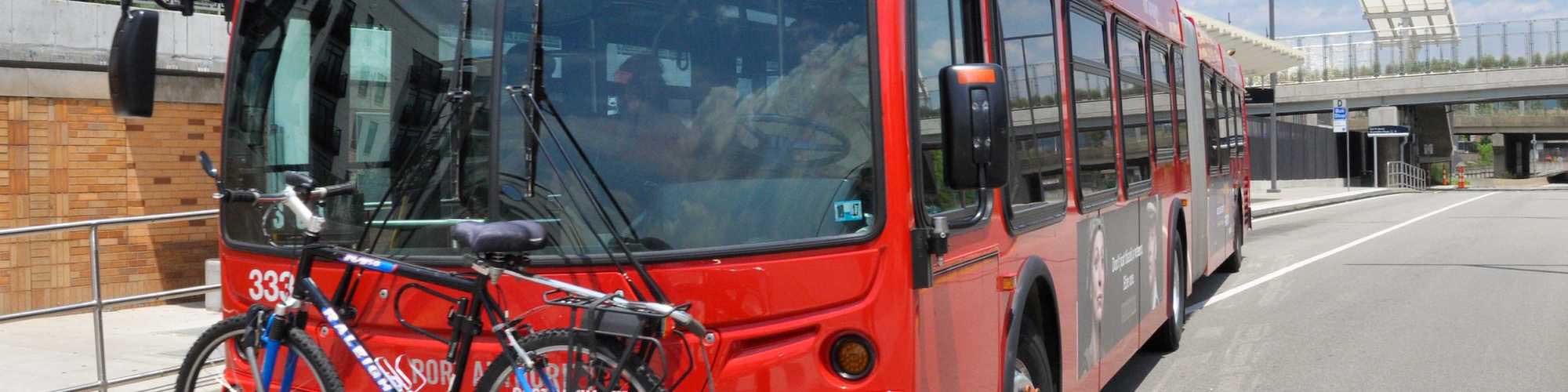 Each of our buses is equipped with a front-mounted bike rack that holds two bicycles.