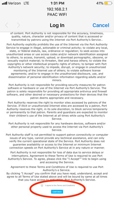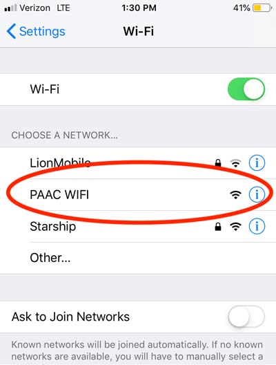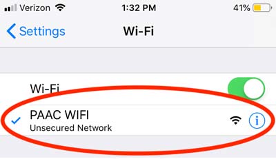 After boarding the vehicle and paying your fare, use your device connectivity setting to pull up the PAAC WIFI network: